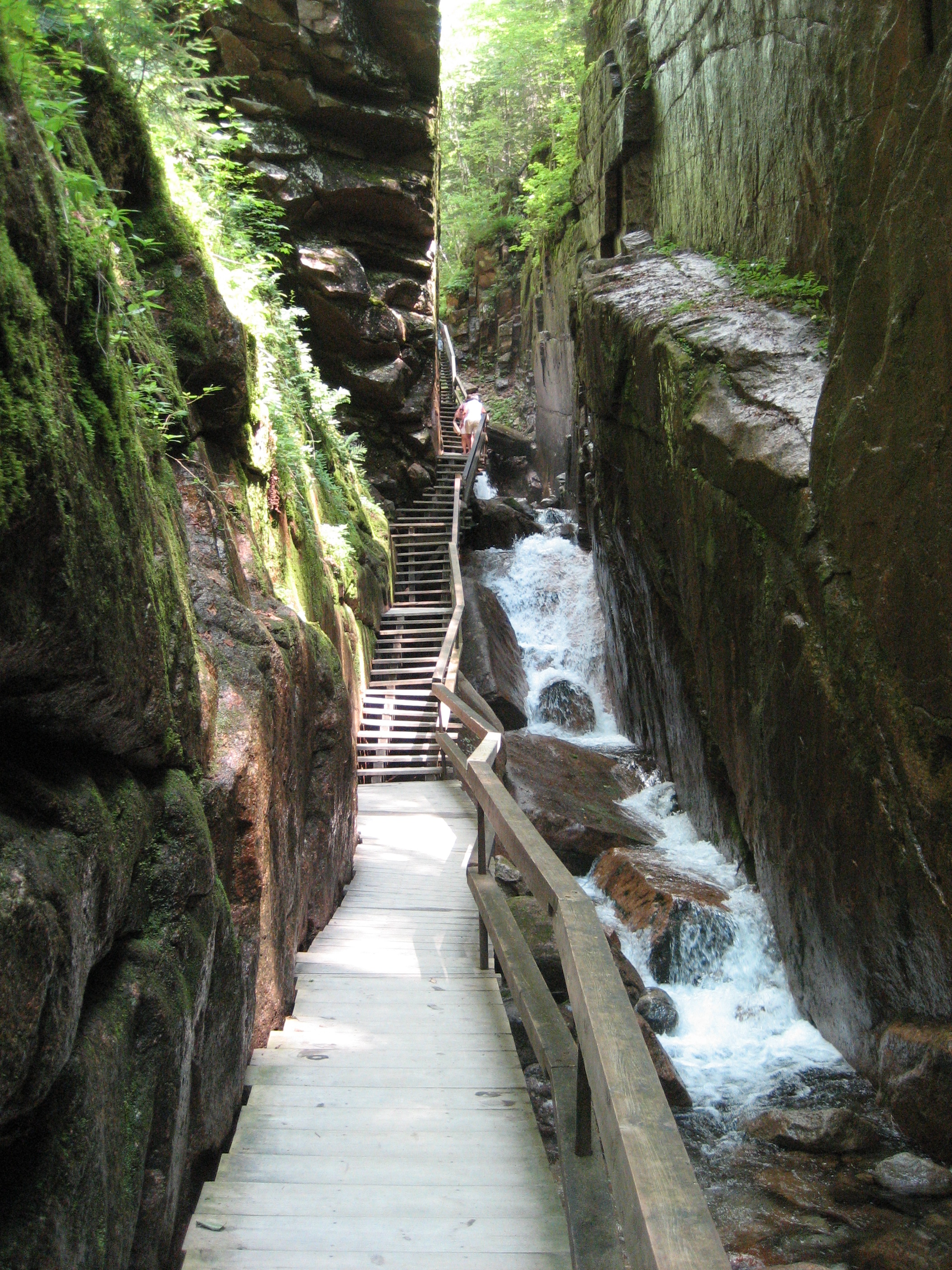 In Franconia Notch State Park. It was an extraordinary summer for heat in New Hampshire this year. I wrote about this as a good escape from the hot weather last year. This year, we really put it to the test. It was the perfect choice. If it’s hot outside and you want some outdoor activity, I can verify this is an excellent choice. The trail is very civilized. You will never mistake this for a wilderness adventure. But they parks department has kept this place well and it’s still amazing for us city folks to see so many interesting things.